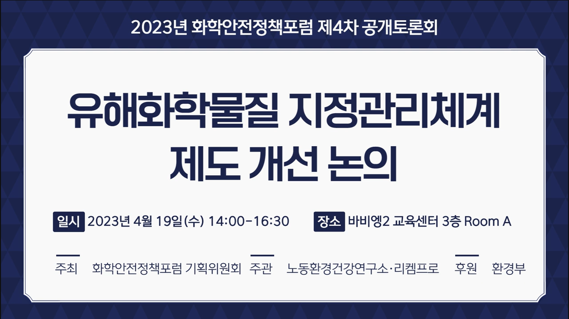 ¸®ÄÍÇÁ·Î(ÁÖ) ÀÌÀºÁ¤ ´ëÇ¥´Â 2023³â 4¿ù 19ÀÏ ¼¿ï Áß±¸ ¼ÒÀçÀÇ ¹Ùºñ¿¨2 ±³À°¼¾ÅÍ¿¡¼ ¿¸° 2023 ÈÇоÈÀüÁ¤Ã¥Æ÷·³ 2ÁÖÁ¦ °ø°³Åä·Ðȸ(2Â÷)¿¡¼ À¯ÇØÈÇй°Áú ÁöÁ¤°ü¸®Ã¼°è °³ÆíÀ» À§ÇÑ ¹ý·É °³Á¤¾È ¿¬±¸¿¡ ´ëÇÏ¿© ¹ßÇ¥ÇÏ¿´½À´Ï´Ù.ÀÚ¼¼ÇÑ »çÇ×Àº ÈÇоÈÀüÁ¤Ã¥Æ÷·³ À¥ÆäÀÌÁö »ó "2023³â Á¤Ã¥Æ÷·³ > ÁÖÁ¦º°Åä·Ð(2ÁÖÁ¦) > °ø°³Åä·Ðȸ(2)" ¸Þ´º, ±×¸®°í ȯ°æºÎ ´º½º·ëÀÇ ¶óÀ̺꿵»óÀ¸·Î È®ÀÎ °¡´ÉÇÕ´Ï´Ù.